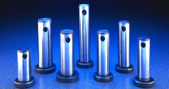 Five metallic cylindrical objects with holes, standing upright on a blue surface.